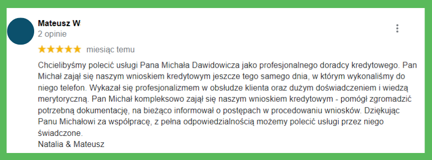 ,,Chcielibyśmy polecić usługi Pana Michała Dawidowicza jako profesjonalnego doradcy kredytowego. Pan Michał zajął się naszym wnioskiem kredytowym jeszcze tego samego dnia, w którym wykonaliśmy do niego telefon. Wykazał się profesjonalizmem w obsłudze klienta oraz dużym doświadczeniem i wiedzą merytoryczną. Pan Michał kompleksowo zajął się naszym wnioskiem kredytowym - pomógł zgromadzić potrzebną dokumentację, na bieżąco informował o postępach w procedowaniu wniosków. Dziękując Panu Michałowi za współpracę, z pełną odpowiedzialnością możemy polecić usługi przez niego świadczone."