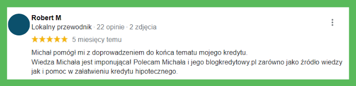 Wiedza Michała jest imponująca! Polecam Michała i jego blogkredytowy.pl zarówno jako źródło wiedzy, jak i pomoc w załatwieniu kredytu hipotecznego."