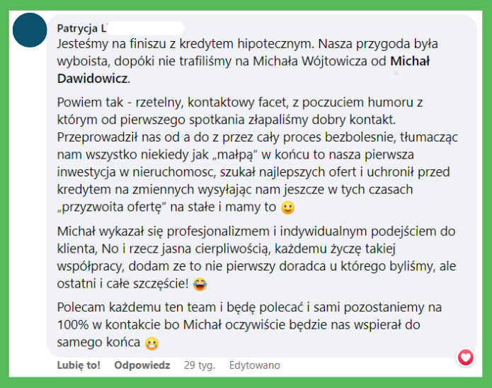 ,,Michał pomógł mi z doprowadzeniem do końca tematu mojego kredytu.
